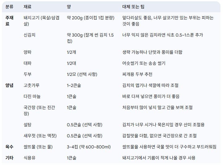 - 참치/꽁치 통조림 추가: 돼지고기가 없다면 참치나 꽁치 통조림을 활용해도 맛있습니다. 이때는 통조림 기름도 함께 넣어 끓이면 풍미가 좋습니다.